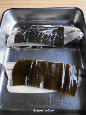 酢から上げて、骨・薄皮を剥いて・・昆布を巻いてラップでお食事timeまで冷蔵庫で寝かせます。