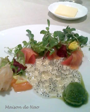 コースメニューの前菜☆トマトとサーモン&トマト・ジュレにバジルのソルベ!