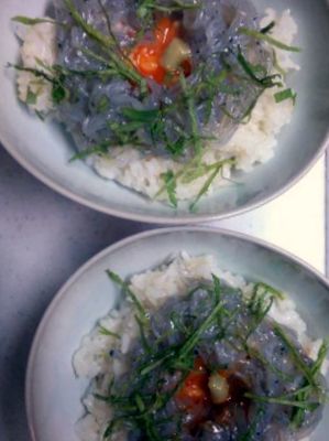 ちょこっと、しらうおに黄味をのせて最高の丼の完成~