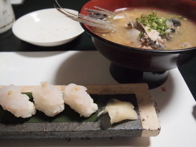 〆は、白エビの握りとあら汁